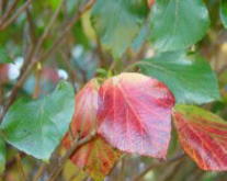 | 花は白い小形。4月下〜5月上旬 | 葉芽、花芽 | 果実は9月下旬〜10月上旬に 熟する。赤い実と光沢のある葉 が印象的。 |