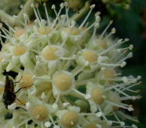 花弁5、雄しべ5本(写真上右)、雌しべ(花柱) 4-6(写真下左)。果実は翌年4-5月に黒紫色に 熟する。偏球形で直径7-11mm。 ■鹿児島では、近隣に伝染病が発生すると※ |