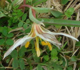 鱗茎は、漢方で滋養強壮剤とする。花被片は6枚。白色で暗紫色のすじがある 分布:本州中部以西の日本,中国,朝鮮 花を下横から見る 花径は約2.5cm。陽が当たると開花 陽当たりのよい草地に生える