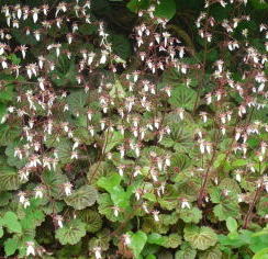 ユキノシタ ユキノシタ科 (雪下) 薬草として、また、庭園に植え涼を添える可憐な草本として知られる。本州、四国、九州、中国の湿った岩場などに分布する多年草。 名前は、雪のような白花の下に葉が見え隠れするため。雪の下でも葉が枯れないため。「雪の舌」で2枚の垂れ下がった花弁を雪に例えたなどの説がある。葉は厚く、両面に粗毛がある。普通、上面は暗緑色で白斑がある。下面は暗赤色。花は5-6月頃。 葉は煎じてむくみの利尿、解熱、咳止めに使う。また、民間では、生葉をもんだり、火にあぶり腫れ物にはる。葉汁は耳だれの薬にした。 |