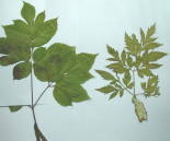 | 葉鞘に包まれていた花序 | 傘状に開いた花と葉鞘を脱いだ花序 | シシウド葉とヨロイグサ葉 |